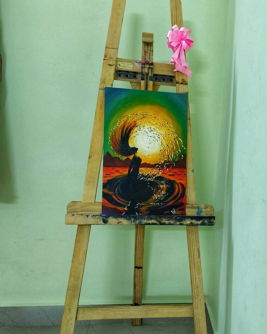 Inspired by the "golden hour" at the beach, this painting explores the intersection of human energy and the natural elements. The hair flip is a symbol of liberation and refreshing rebirth. By fracturing the image into horizontal bands, the artist represents how we experience moments of joy—as a series of fast-moving, overlapping sensations that blur into a single, beautiful memory of light and water.